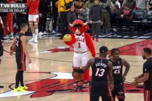 等待期间,热火球员希罗与公牛吉祥物进行半场背投比赛,结果公牛吉祥物一击命中,希罗见状宣布直接退出较量。