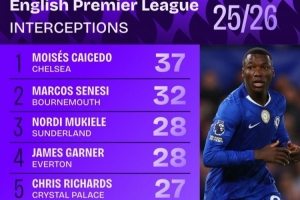 本赛季英超成功拦截榜: