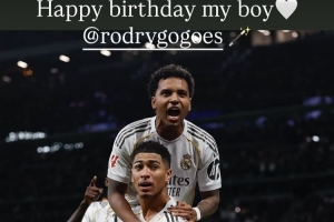 体育资讯1月10日讯 皇马边锋罗德里戈在今日迎来了25岁生日,他的队友贝林厄姆也通过社媒送上祝福。