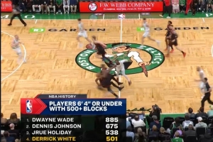 6尺4以下球员500+盖帽榜:榜首韦德885帽,第2位丹尼斯·约翰逊675帽,第3位朱·霍勒迪538帽