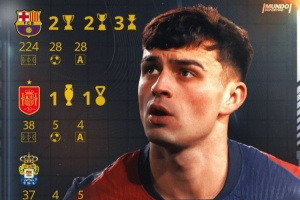 《世界体育报》列出了佩德里职业生涯至今的数据,他总计出战299场比赛,打进37球,助攻37次,赢得8座冠军奖杯。