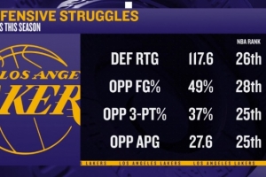 体育资讯1月17日讯 今日,ESPN总结了湖人本赛季至今糟糕的防守数据: