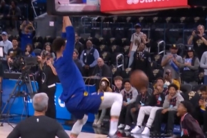 赛前热身,库里在一位孩子的配合下,完成了空接暴扣,这一幕也惊呆了场边的“小学生”。