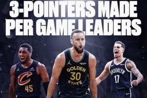 场均三分榜单,库里唯一4+,场均4.5个领跑全联盟!