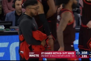 怀特已经有27场比赛中至少命中了6记三分球,这一成绩在公牛队历史上排名第二(仅次于拉文的33场)。