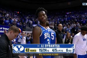 单场43分也让他超越了丹尼·安吉成为杨百翰大学的大一新生单场得分王。