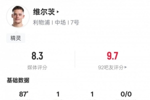 体育资讯2月1日讯 英超第24轮,利物浦主场迎战纽卡斯尔,维尔茨首发出战,传射建功,还送出2次关键传球,3次解围,评分8.3。