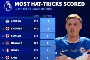 体育资讯2月10日讯 切尔西在本轮英超3-1击败狼队,帕尔默上演帽子戏法,《转会市场》统计显示帕尔默已经在英超4次戴帽,位列联赛历史第16位。