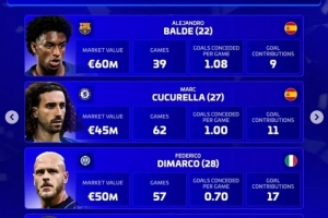 巴尔德(巴萨,22岁,西班牙):身价6000万欧,39场,场均丢1.08球,直接参与9球