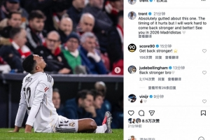 阿诺德社媒写道:“对这次受伤真的感到非常沮丧。这个时机太难熬了,但我会努力训练,变得更强、更好!2026年再见,皇马球迷们 🤍”