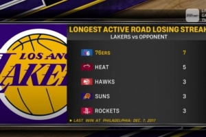 赛前湖人转播商晒出一组数据,列举湖人目前面对不同对手的最长客场连败纪录:
