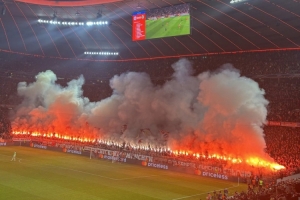 体育资讯12月10日讯 拜仁在本轮欧冠对阵葡体,南看台死忠在比赛中燃放焰火。