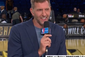 体育资讯12月17日讯 NBA杯决赛,马刺vs尼克斯。诺维茨基担任现场解说嘉宾。