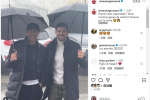 西蒙尼看望自己的儿子吉奥瓦尼·西蒙尼,后者社媒晒出父子合照,配文:“这真是特别的时光,我一直都渴望与你们相见,感谢你们的到访。”