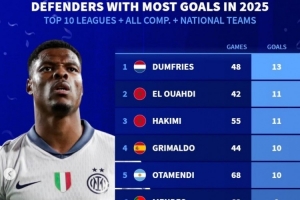 德转列2025年各项赛事后卫进球最多榜:邓弗里斯、阿什拉夫在列