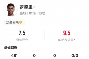 体育资讯1月5日讯 2025-26赛季英超联赛第20轮,曼城主场迎战切尔西。罗德里首发出战,上半场送出3次关键传球,4次抢断,6次地面对抗5次成功,评分7.5。