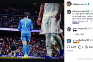 皇马门将库尔图瓦社媒晒出比赛照片,配文:“精彩的比赛,又一场由我们青训球员的进球带来的胜利。”