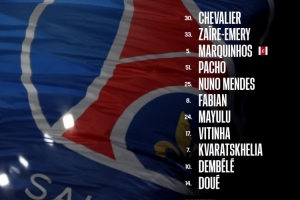 30-舍瓦利耶、33-扎伊尔·埃梅里、5-马尔基尼奥斯、51-帕乔、25-努诺·门德斯、8-法比安·鲁伊斯、24-马尤卢、17-维蒂尼亚、7-克瓦拉茨赫利亚、10-登贝莱、14-杜埃
