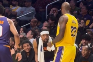 GIF-詹姆斯在场上和场边的古德温聊天