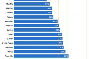 布莱顿以49%的比例表现最佳,财务状况最为健康,热刺和曼联紧随其后。然而,不少俱乐部面临合规压力,维拉、诺丁汉森林等队已超过欧足联设定的限制线,而伯恩茅斯更是以104%的比例高居榜首,甚至突破了英超联赛设定的“绿色”安全阈值,显示出较高的财政风险。