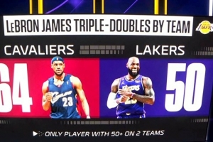 詹姆斯生涯在两支球队拿到50次三双(骑士64次),历史唯一。