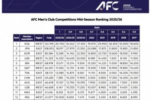 2025/2026赛季亚足联男子俱乐部赛事中期排名榜(前10):