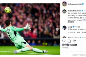库尔图瓦社媒晒出扑救照片,配文:“在圣马梅斯取胜绝非易事,而我们今天赢得干脆利落。这正是我们想要继续前进的道路!”